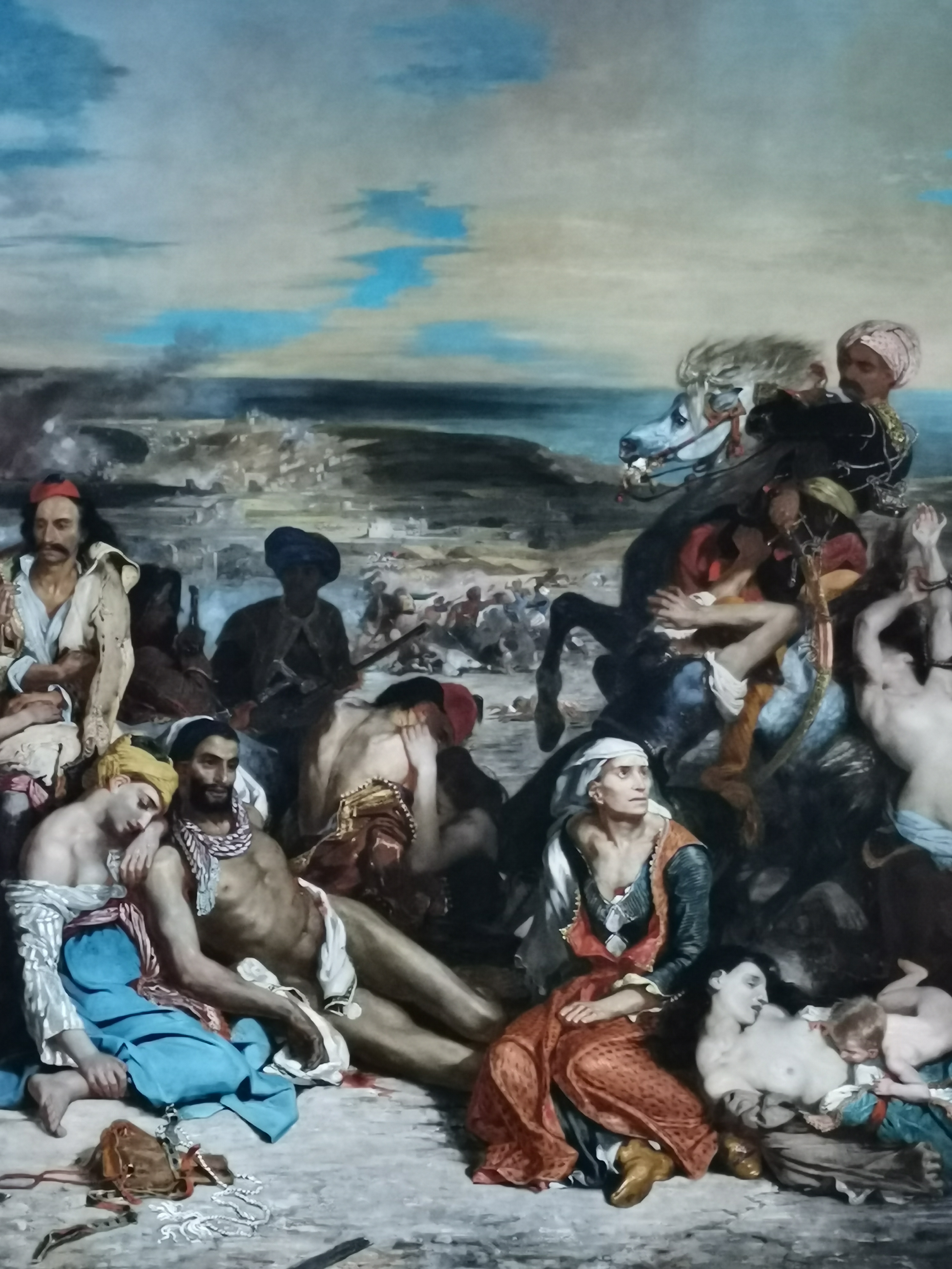 Την δε 30, ήτοι την μεγάλην πέμπτην, εφάνη έξωθεν της Χίου ο στόλος υπό τον καπητάμπασαν Καραλήν, εκ 46 πλοίων, εξ ών 6 δίκροτα και 9 φρεγάται και κορβέτται, τα δε λοιπά βρίκια, και βομάρδαι• έφερε δε και επτακισχιλίους οπλοφόρους…επειδή επί της εισβολής των εχθρών οι πλείστοι των εν τη πόλει Χριστιανών απεμακρύνθησαν εις τα ενδότερα της νήσου προς αποφυγήν του κινδύνου…την δε κυριακήν του Πάσχα (2 απριλίου) εξεστράτευσαν κατά του μοναστηρίου του αγίου Μηνά…εντός του κατέφυγαν 3000 Χίοι ως εις ασφαλές μέρος. Οι Τούρκοι, πεσόντες πανταχόθεν επί το περιτείχισμα και σπάσαντες αυτό, εισέδυσαν ξιφήρεις μετά τινα αντίστασιν, κατέκαυσαν το μοναστήριον, και τους εγκλείστους εκτός ολίγων εξωλόθρευσαν τους μεν διά σιδήρου τους δε διά πυρός…εκατόν δεκατρείς χιλάδες ηριθμούντο οι καθ’ ολην την νήσον Χριστιανοί την 30 μαρτίου• 1800 εναπέμειναν τον αύγουστον• εν τω μεταξύ δε τούτω 23,000 εφονεύθησαν, 47,000 κατά το κατάστιχον του τελώνου ηνδραποδίσθησαν, οι δε λοιποί τήδε κακείσε κακώς διεσώθησαν. Τοιουτοτρόπως η περίφημος Χίος, η νήσος της τρυφής, του πλούτου και της παλυανθωπίας, έγεινε τόπος ερημώσεως και δακρύων.